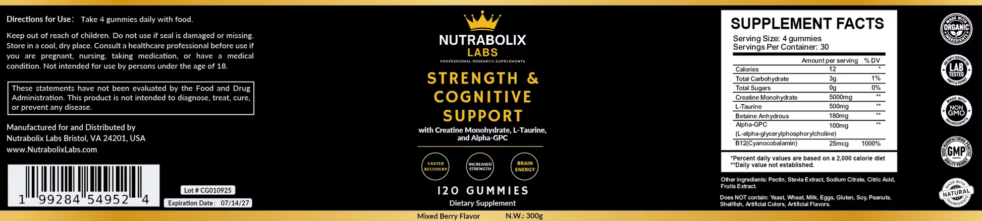 This full-spectrum formula stacks creatine’s physical and cognitive benefits with hydration-enhancing taurine and betaine, focus-boosting Alpha GPC, and energizing B12 — giving you both body and brain support in one powerful, convenient gummy.