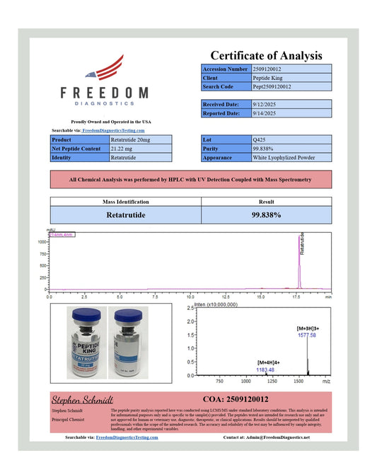 Peptide King products are furnished for LABORATORY RESEARCH USE ONLY. This product should only be handled by qualified, and licensed professionals. The product may not be used as a drug, agricultural or pesticidal product, food additive or household chemical – and may not be misbranded as such. All information on this website is available for educational purposes only. Bodily introduction of any kind into humans and/or animals is strictly forbidden by law.